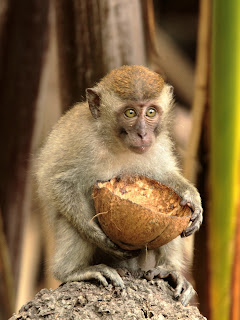 A candid shot of a juvenile macaque with a coconut shell as if waiting for alms. I must say there is many marauding macaques here just like in Kuala Selangor Nature Park and they may be quite intimating when they show their fangs. Careful if you have food with you as they can pounce on your food if you are not vigilant.